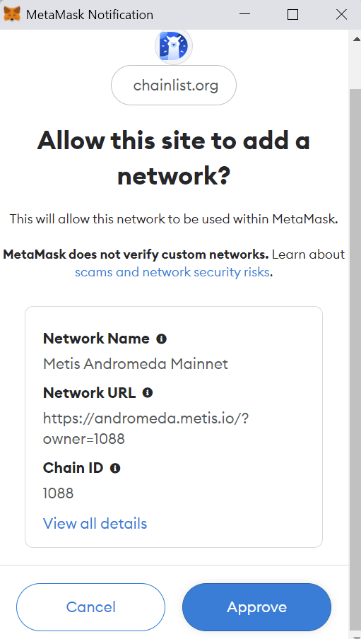 You must use the search engine to find the network you want to add to Metis. Click on add to metamask, and the metamask wallet will open with the information to add the network. Click on approve and you are done. So easy, you will have the Metis network added in a very simple way, and without the need to enter the data yourself.