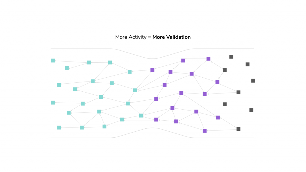 Estructura – La cadena de bloques consiste en una serie de nodos, o bloques de datos; cada uno unido al anterior en una cadena larga y en constante crecimiento. El enredo, por otro lado, está construido por un grupo de nodos de datos que fluyen en una sola dirección. Y, mientras que la cadena de bloqueo puede técnicamente retroceder sobre sí misma de forma circular, la maraña sólo puede moverse en una dirección, nunca retroceder. Esto permite una transferencia de datos más rápida.