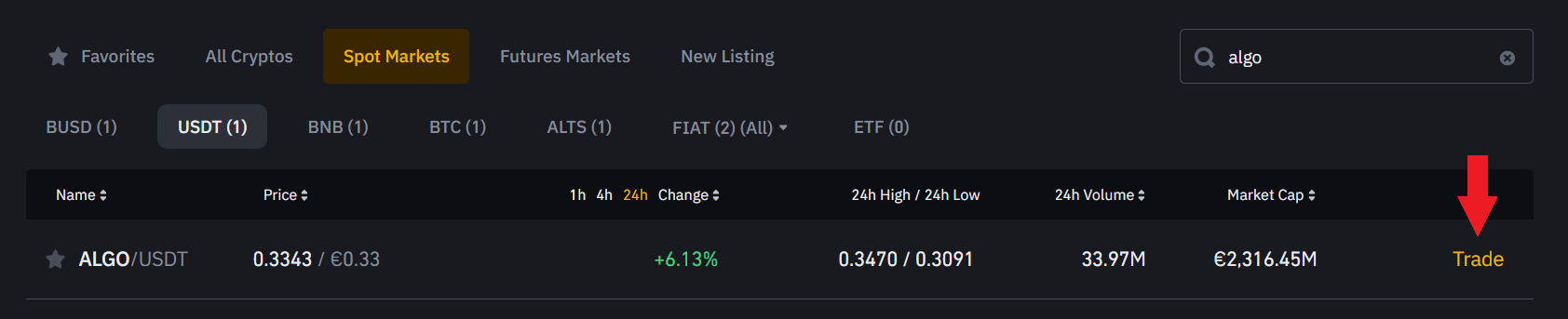 - Ve a mercados y busca ALGO para encontrar el par ALGO/USDT