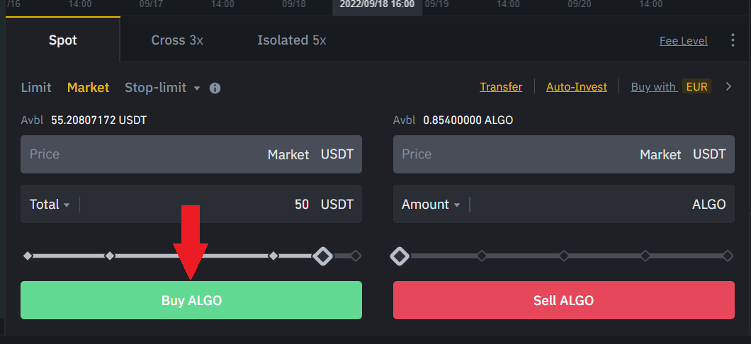 Busca el par ALGO/USDT, y pulsa en él. Ve debajo al centro, y dirigete a la parte de vender en rojo. Indica la cantidad que quieres vender de Algorand y cambiar por USDT. Pulsa en vender y listo. Ya habrás vendido tus ALGO y tendrás USDT de nuevo.