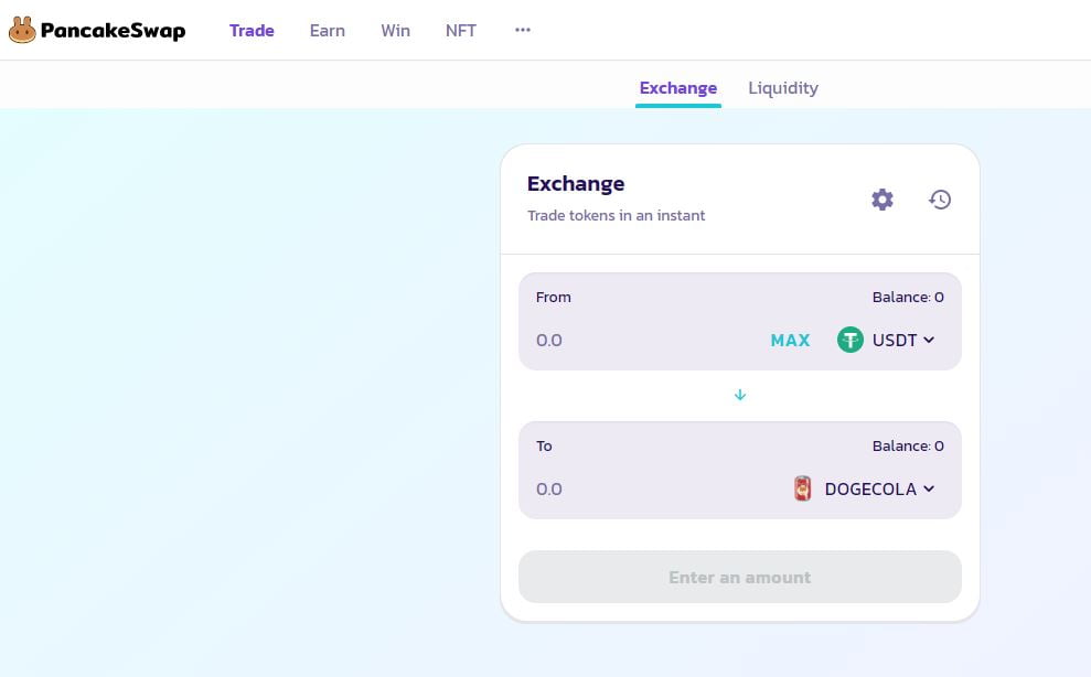 Si ya tienes en tu wallet de metamask Binance Coin para pagar por las comisiones, inferiores a un dólar, simplemente vas a tener que dirigirte a pancakeswap, y copiar el contrato de DogeCola para poder encontrar el token. Esto puedes encontrarlo en Coingecko o coinmarketcap buscando DogeCola o puedes copiar el contrato de la red de Binance justo debajo: