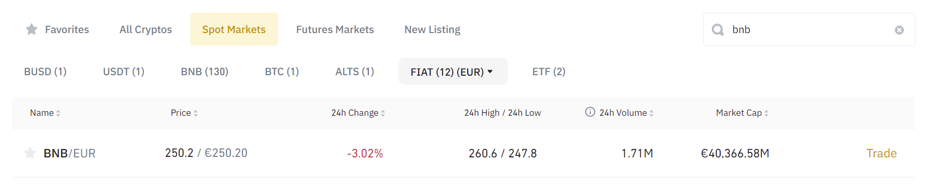 Con tu primer deposito, ya sean euros, dólares u otra divisa, debes dirigirte en mercados, y buscar tu divisa respecto a Binance coin (BNB). En mi caso, EUR/BNB. Aquà ir al botón rojo de vender, y cambiar tu divisa, en mi caso euros, por BNB. Usamos BNB porque las comisiones en la red de Binance se pagan con esta criptomoneda, como sucede con la red de Ethereum con ETH. Puedes comprar también USDT (Tether), pero siempre debes tener una cantidad pequeña de BNB en tu wallet de metamask para pagar por las comisiones, inferiores a 1$. Con 10-15$ de BNB es suficiente para varias transacciones y no quedarte sin BNB.