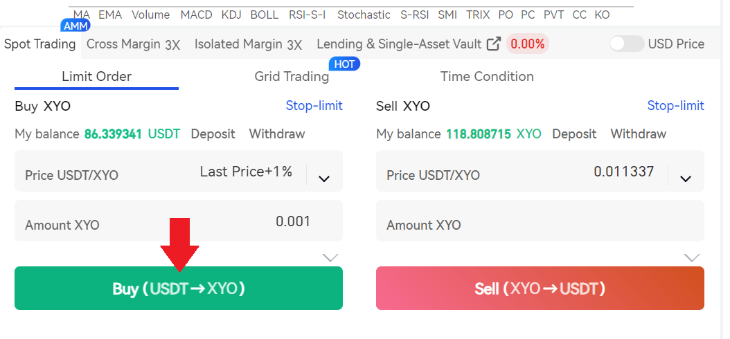 Vas a ver el panel para comprar y vender criptomonedas. AquÃ, busca XYO, y verás que te aparece el par XYO/usdt.Â