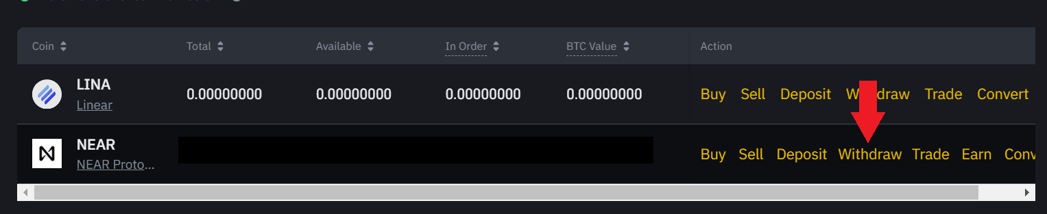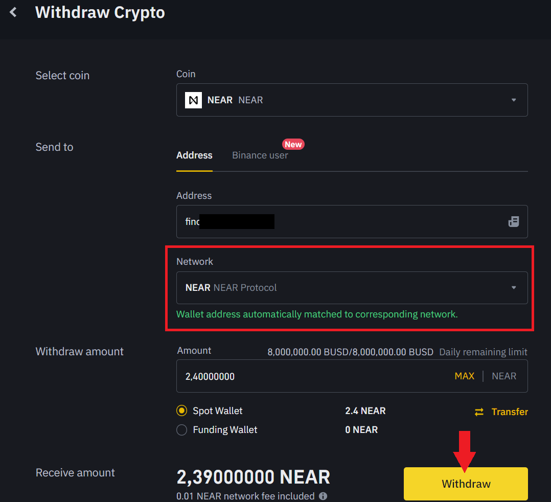 Suchen Sie auf Ihrem Computer unter Spot Wallet nach Near und klicken Sie auf withdraw. Sie sehen nun das Feld zum Abheben der Kryptowährung.