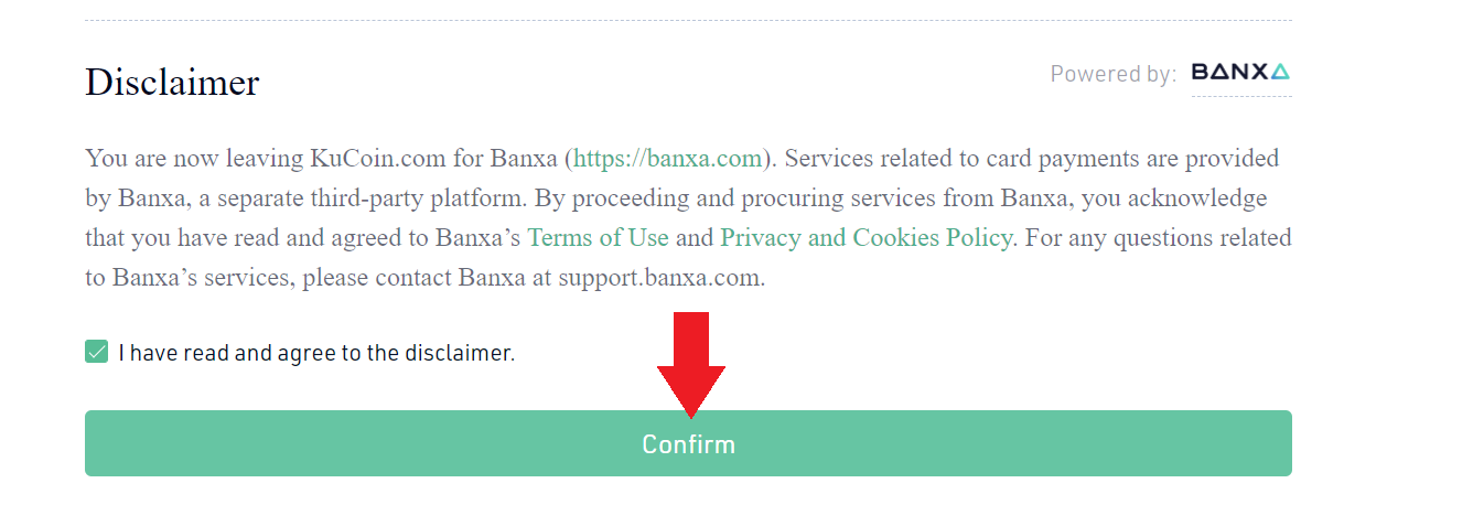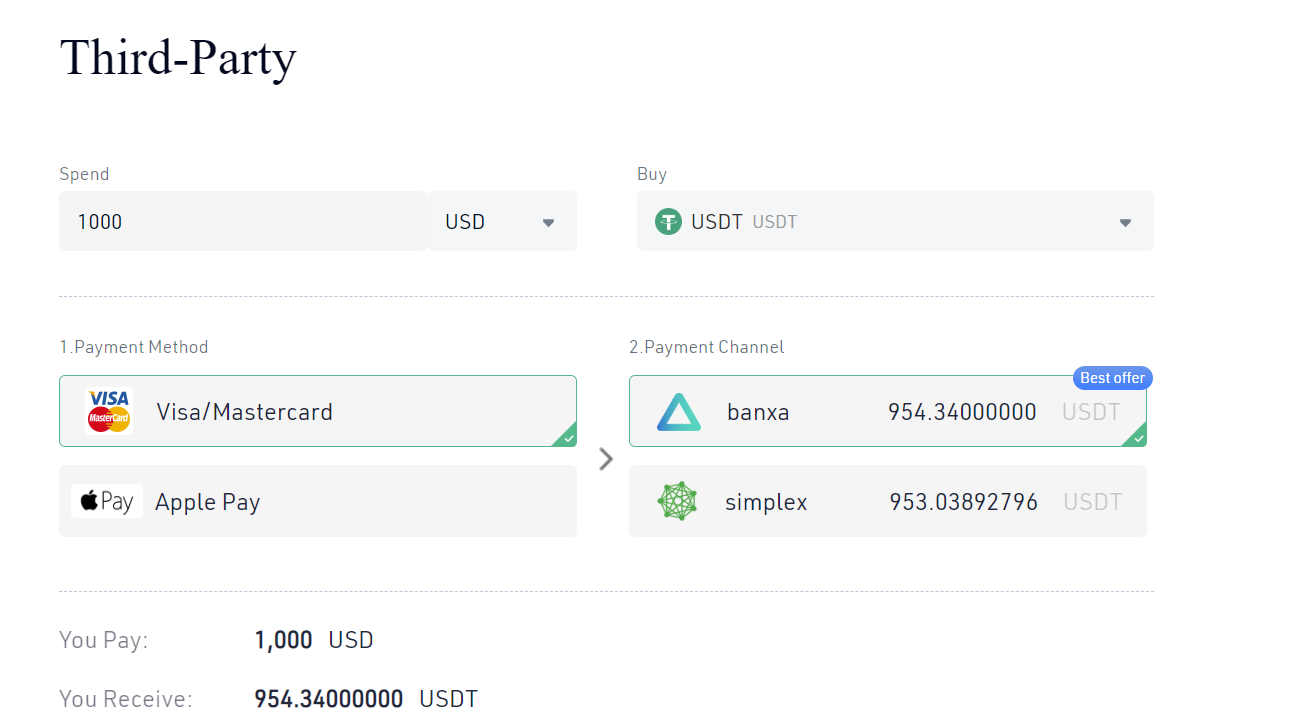 Wie Sie sehen können, gibt es im Fall von usdt zwei Optionen, banxa und simplex. Als banxa die beste Option, mit einer Provision nahe 5%. Wählen Sie die gewünschte Option aus, und klicken Sie auf „Bestätigen“. Folgen Sie den Schritten mit den Informationen, die Sie zur Bestätigung der Transaktion und zur abschließenden Zahlung mit Ihrer Kreditkarte aufgefordert werden.
