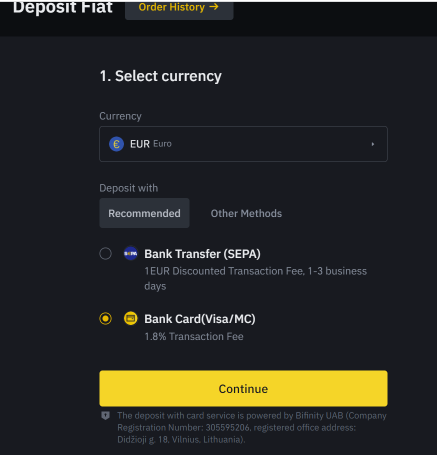 Wenn das gesagt ist, fangen wir an. Der erste Schritt ist die Einzahlung von Geld auf Binance, entweder in Euro oder in Ihrer Währung. Der beste Weg für mich ist die Kreditkarte, auch wenn hier eine Gebühr von 1,8 % anfällt, haben wir dann sofort Geld zur Verfügung. Wenn Sie Provisionen sparen wollen, können Sie die Banküberweisung nutzen, aber Sie müssen einige Tage warten, bis Ihre Einzahlung ankommt.