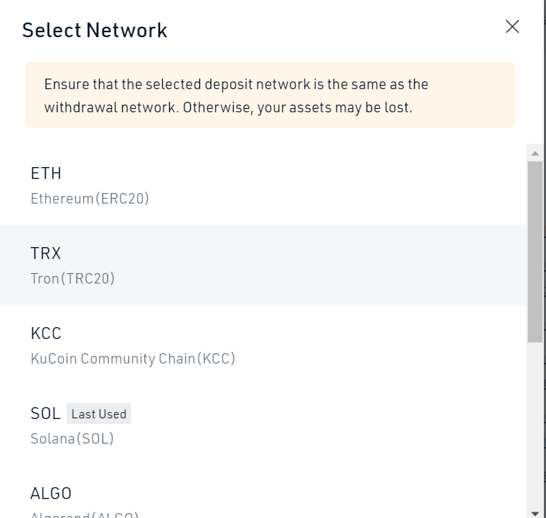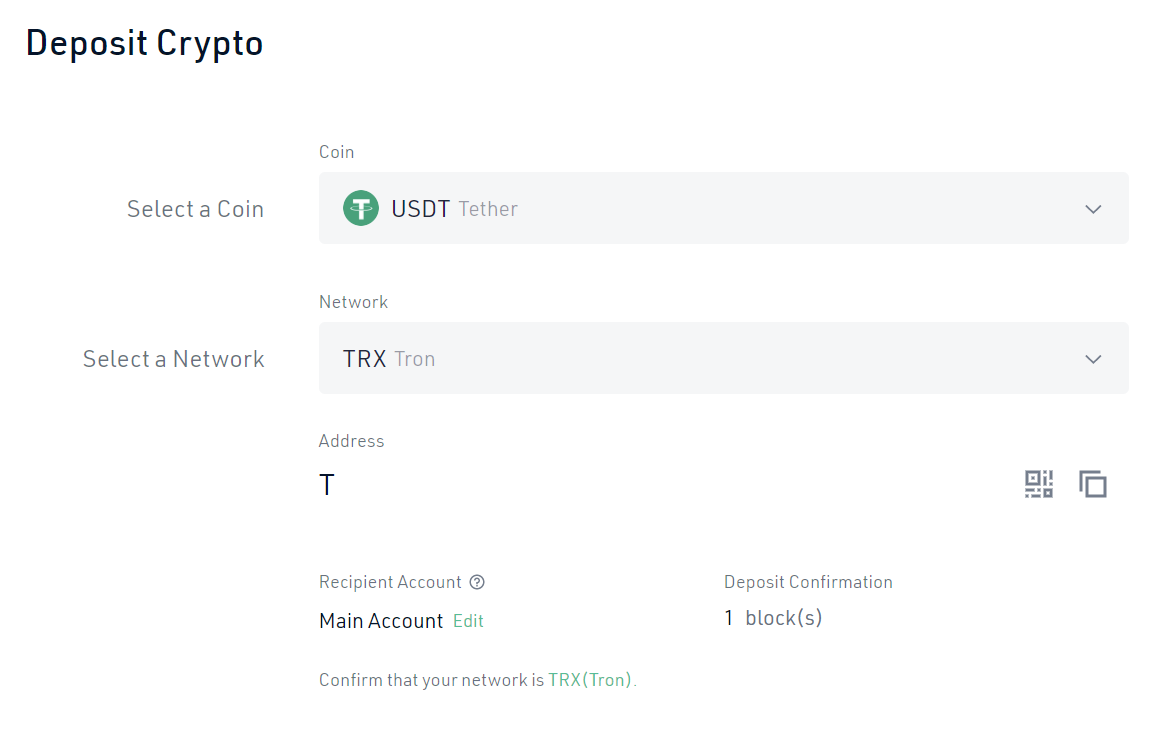 Hier, das erste, was wir müssen die kucoin Adresse angeben, wo Tether zu hinterlegen. Um zu wissen, wie die Adresse lautet, müssen wir zu kucoin gehen und im Hauptkonto nach usdt suchen. Klicken Sie hier auf Einzahlung und wählen Sie das trc-20- oder tron-Netzwerk, da es das günstigste ist.