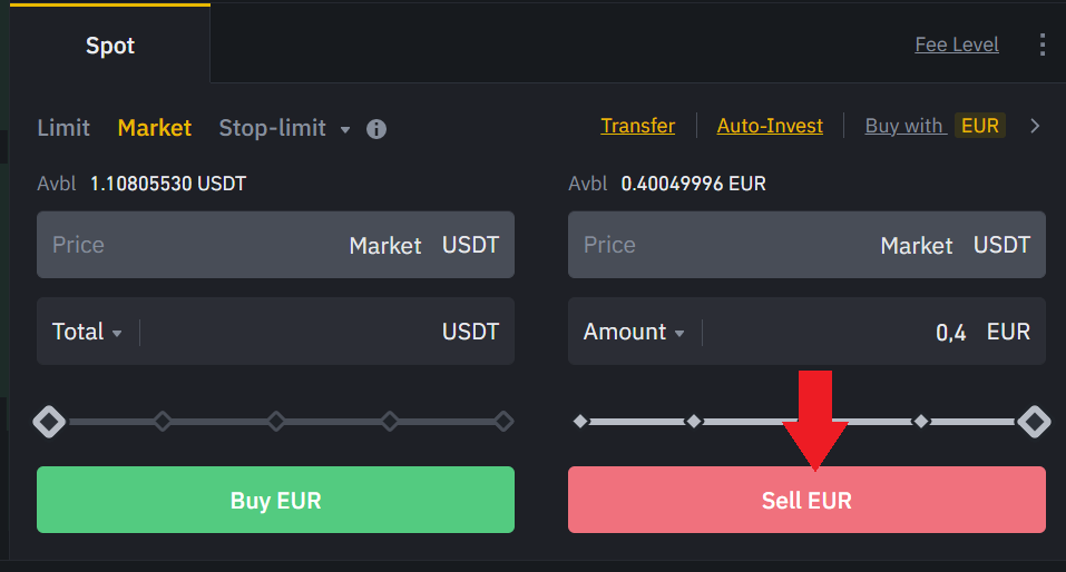 Mit Ihrer Einlage, in meinem Fall Euro, sollten wir Tether oder USDT kaufen. Sie können eine andere Kryptowährung kaufen, aber Tether ist das Kryptowährungsäquivalent zum Dollar und das am häufigsten verwendete, um andere Kryptowährungen auf der KuCoin-Plattform zu kaufen, deshalb ist es für mich die beste Option. Um dies zu tun, gehen wir auf den Markt, Fiat-Märkte, und suchen Sie nach dem Paar Euro/usdt oder mit Ihrer Währung. Hier gehen wir auf Verkaufen und geben den Betrag an, den wir in Tether tauschen möchten.
