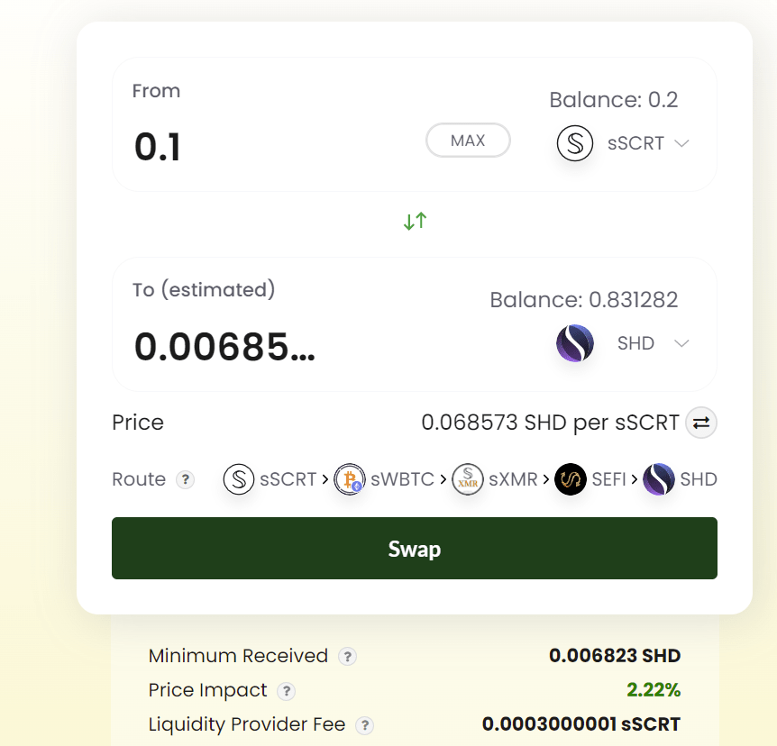 Wenn der Saldo zugänglich ist, geben Sie einfach die beiden Token an, die Sie umtauschen möchten. Sie müssen nicht einmal das Guthaben sehen, das Sie für die gewünschte Wertmarke haben, denn in to können Sie den Betrag sehen, den Sie für diesen Betrag erhalten werden. Hier geben wir die beiden Token an, zum Beispiel sSCRT und SHD und den Betrag. Klicken Sie nun einfach auf Swap, bestätigen Sie die Transaktion in Ihrer Brieftasche und Sie erhalten den anderen Token. In diesem Fall ist es SHD.
