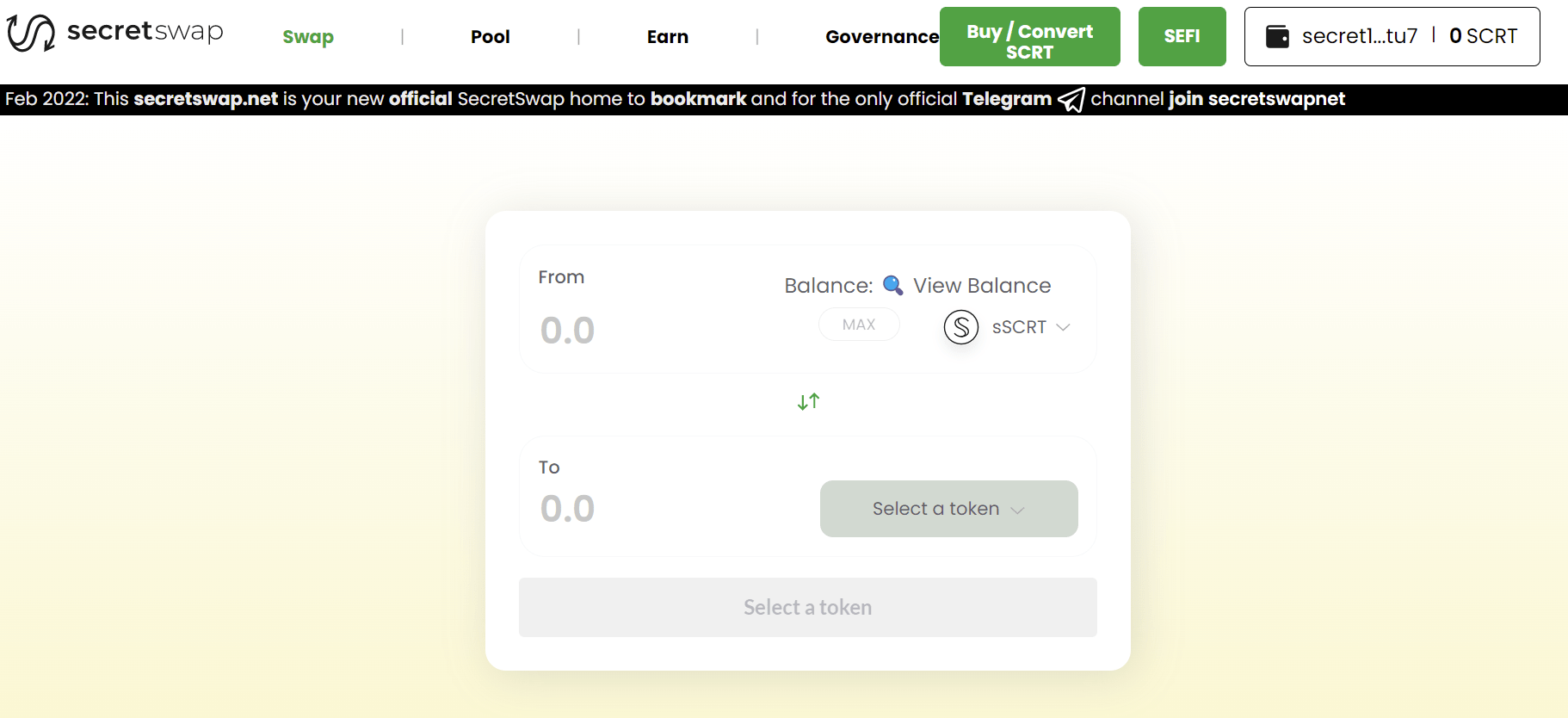 Obwohl Sie normale SCRTs verwenden können, ohne sie in sSCRT in secretswap zu konvertieren, gehe ich davon aus, dass Sie dieses Netzwerk wegen des zusätzlichen Schutzes der Privatsphäre im Vergleich zu anderen Netzwerken verwenden, und daher werden Sie höchstwahrscheinlich Ihre SCRTs in sSCRT konvertieren wollen, bevor Sie irgendwelche Transaktionen durchführen.