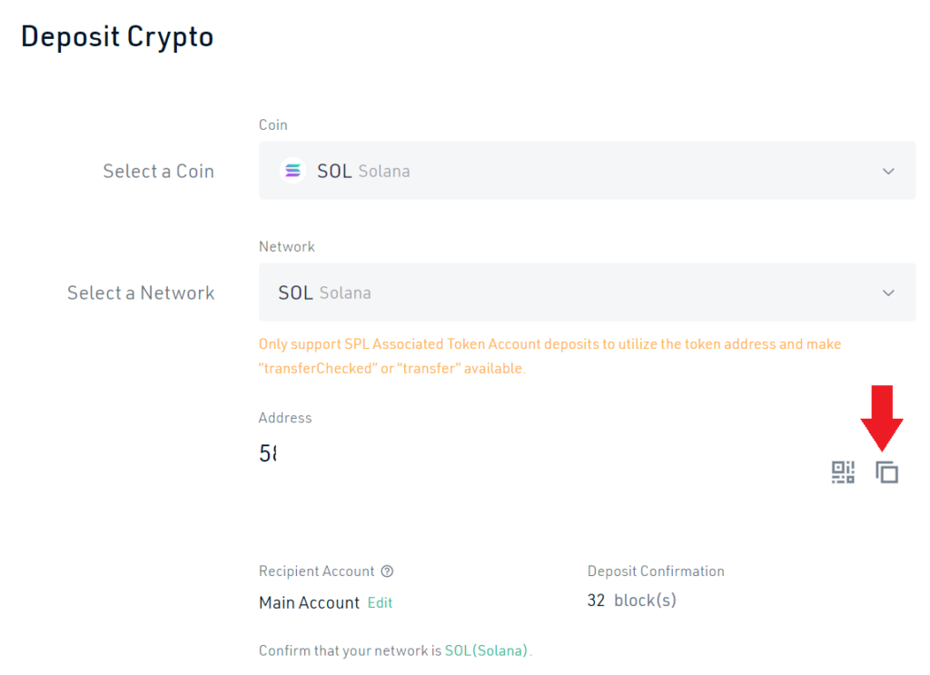 Once selected, in to we will have to indicate the address where to send the SOL. To do this, we must go to kucoin, and in the main menu click on deposit or deposit. Here, look for the Solana cryptocurrency (SOL), and the network indicates Solana. Now, you will see the address that we must copy, by clicking on the right of it.
