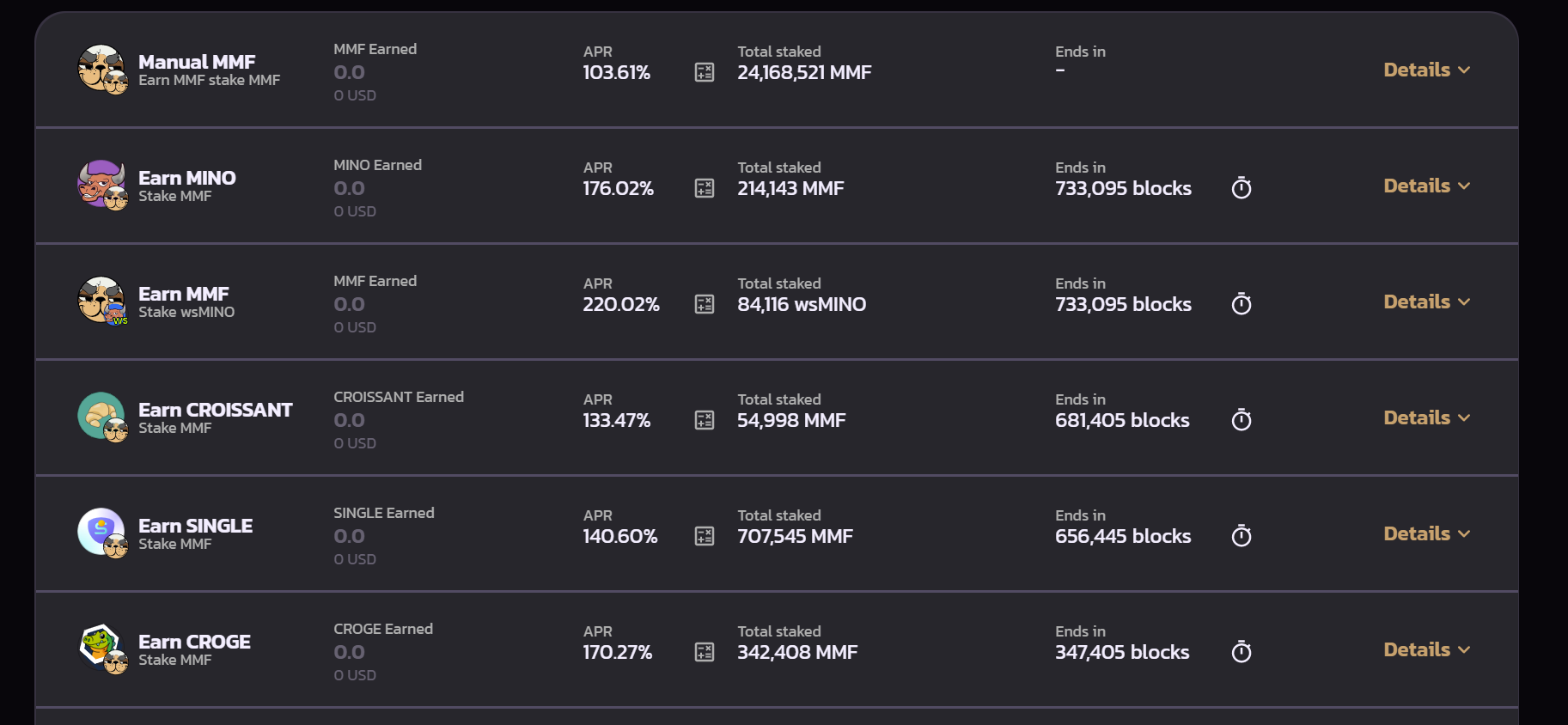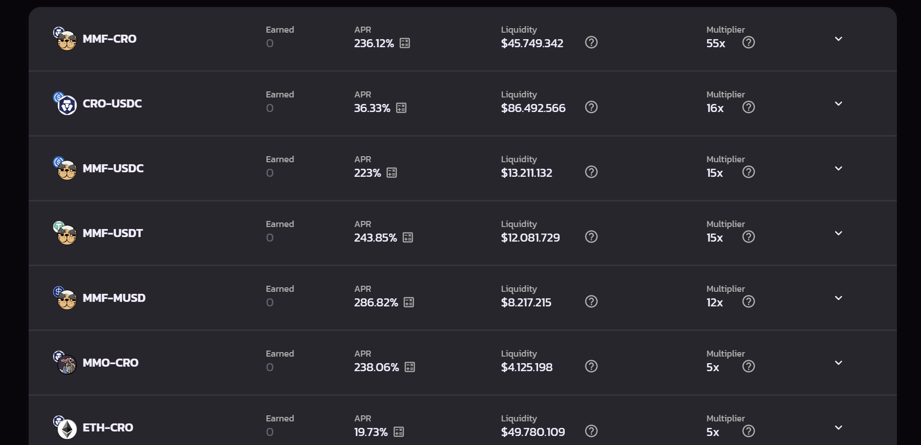 In farms you will find the different farms with LP tokens that are available in MM Finance, with good annual returns. In apr, you can see the annual % that you will receive when placing that LP token. And further to the right a multipler, which is the amount of incentives that LP token has in comparison to the others.