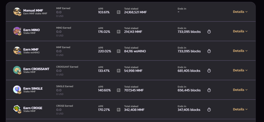 Once you have deposited your LP Tokens, you will receive the MM platform token as a reward, so it is something to keep in mind. Because they tend to be very inflationary tokens, and if they are halved in price, you’re actually getting half the annual apr. So keep this in mind.