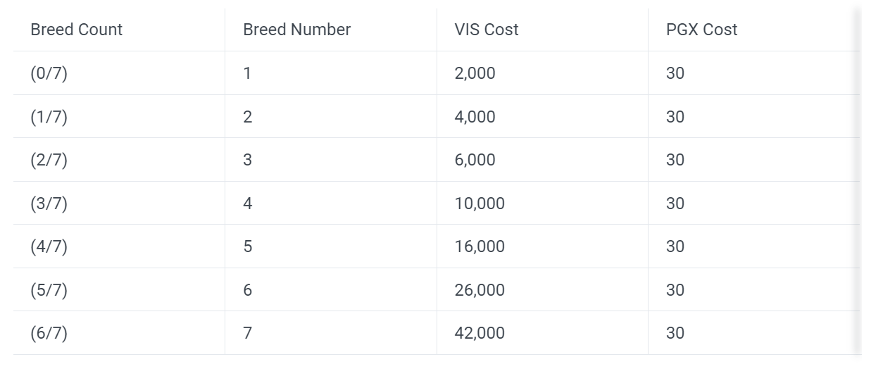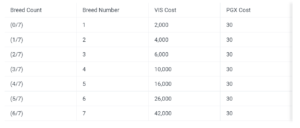 Currently the breeding cost that you can see in the documentation is not updated. So, the PGX breeding cost is correct, but the VIS cost is different from the one you can see in the documentation.