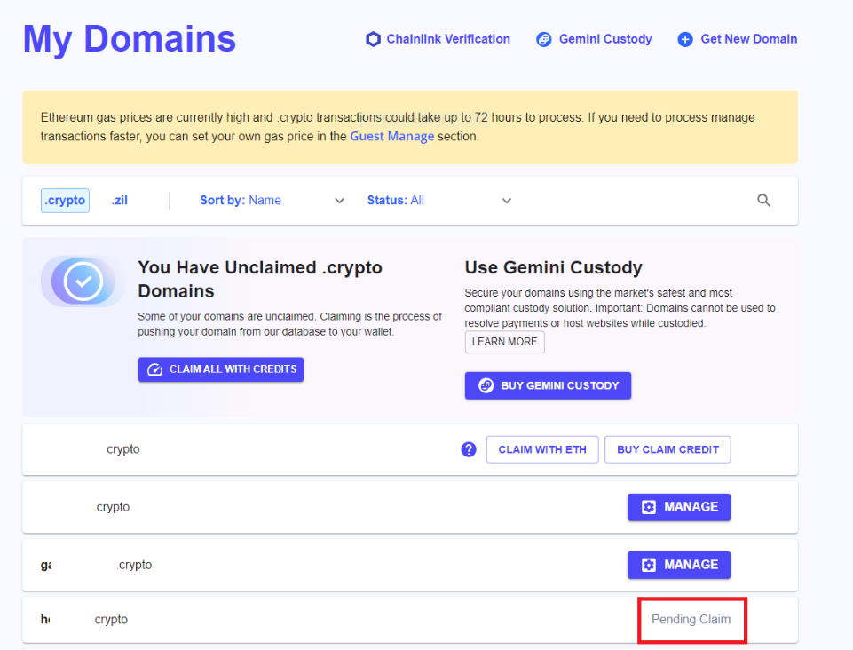 10. Now, you will be able to see a pending claim. In a short time, when the transaction is completed we will see the manage button. Which will mean that we have the domain in our metamask wallet. And we can use it, or sell it on platforms like opensea as we have covered in this tutorial.