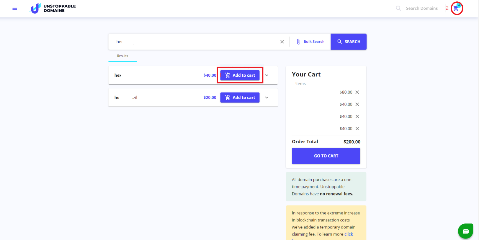 3. Add the domain you want to your cart by clicking on Add to cart. Next, go to the top right corner and click on the cart.