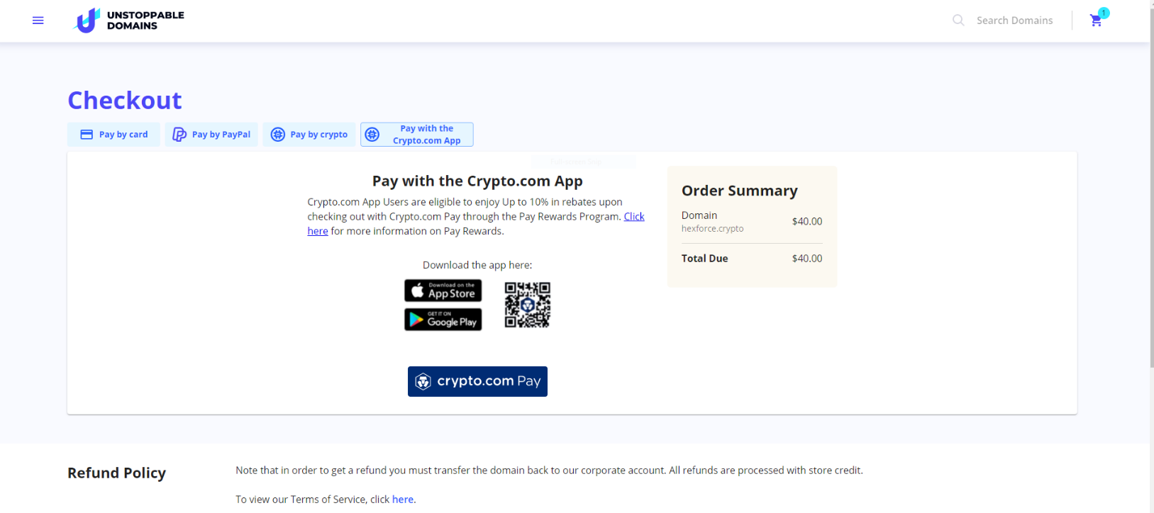 5. You won’t be able to find many ways to pay, but you can use crypto.com to get a 10% discount on your first purchase. In case you don’t have an account with crypto.com, you can use the funds in your metamask wallet, or if you prefer with paypal or debit/credit card. Click on crypto.com Pay at the bottom. A QR code will appear, scan the QR code with your crypto.com app and make the payment.