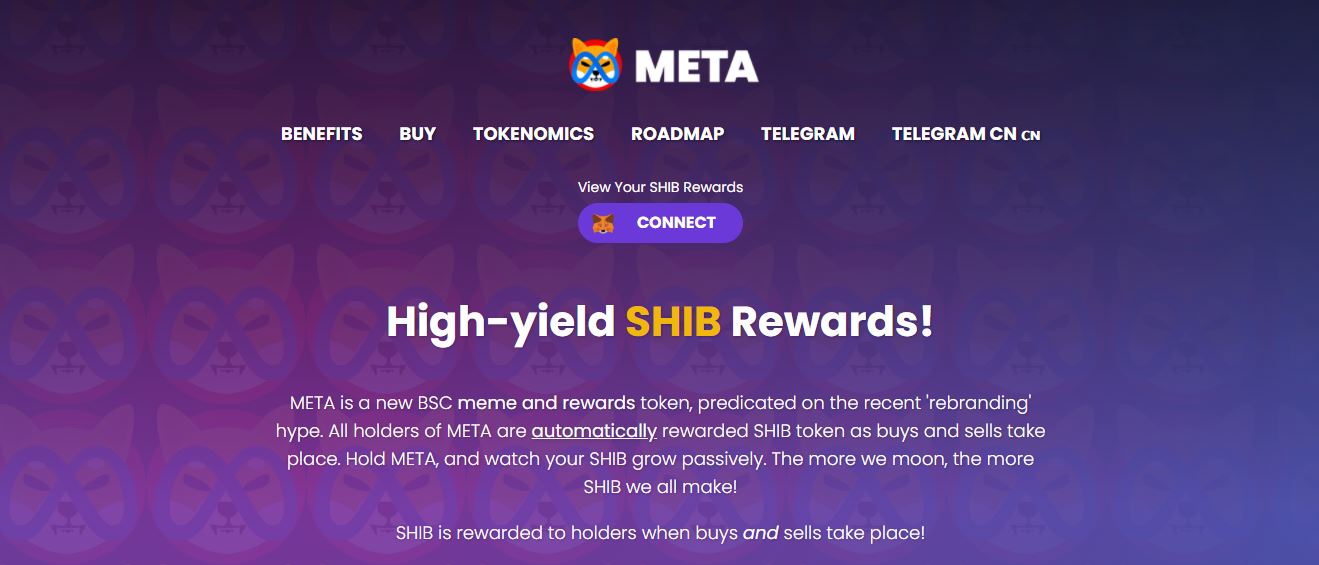 META is a new BSC meme and reward token, based on the recent “rebranding” hype. All META holders are automatically rewarded with SHIB tokens as purchases and sales occur. Keep META, and watch your SHIB grow passively. The more moon, the more SHIB we all earn.