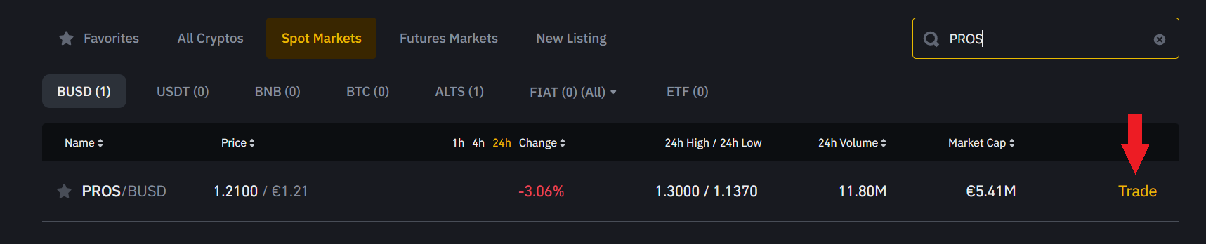 • We go back to the markets and search for PROS, where we will find the PROS/BUSD pair.