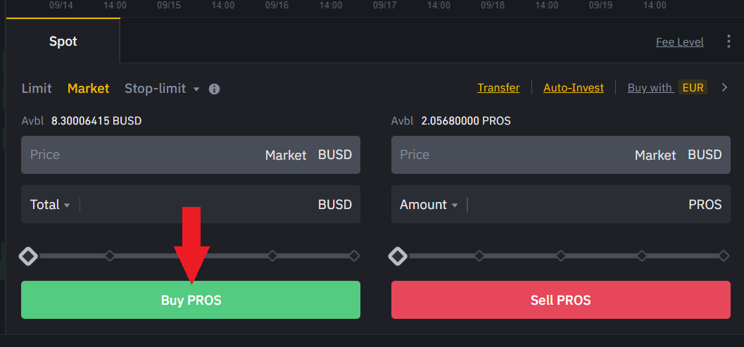 Look for the PROS/BUSD pair, and click on it once you find it. We go to the centre, underneath and look at the red sell part. We indicate to the market on the top right, the amount you want to sell and exchange for BUSD. Click on sell and it will be ready. We will have the PROS sold and we will have BUSD again.