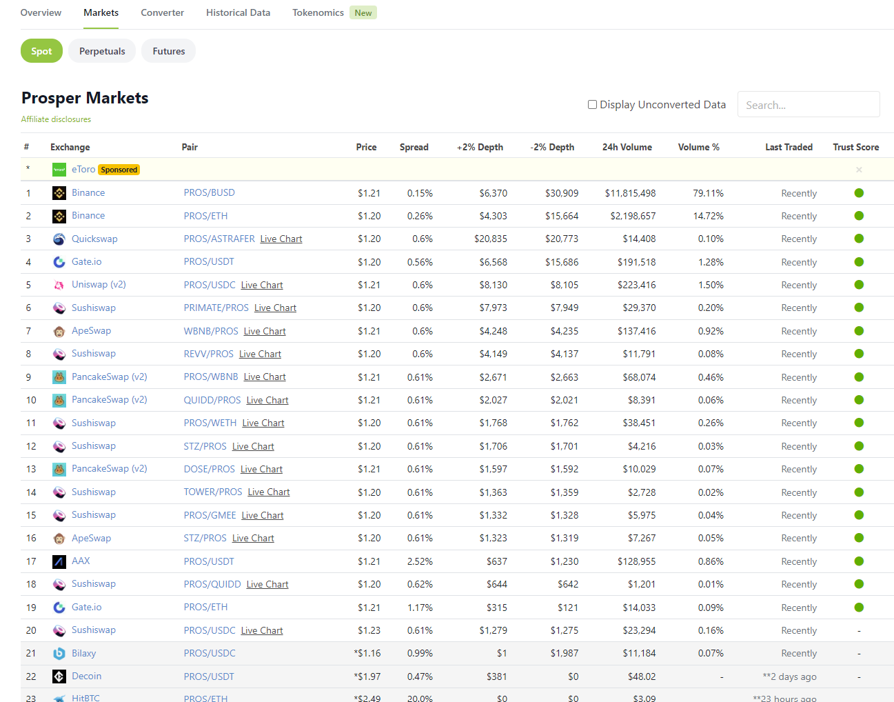 We have already seen how to buy Prosper with Binance, but there are also other places to get this token. In case you already have an account or prefer to use another platform, this list can be of great help. To find out where you can buy PROS, it is as simple as going to coinmarketcap or coingecko. Here, search for the cryptocurrency, in this case PROS. And once there, click on markets.
