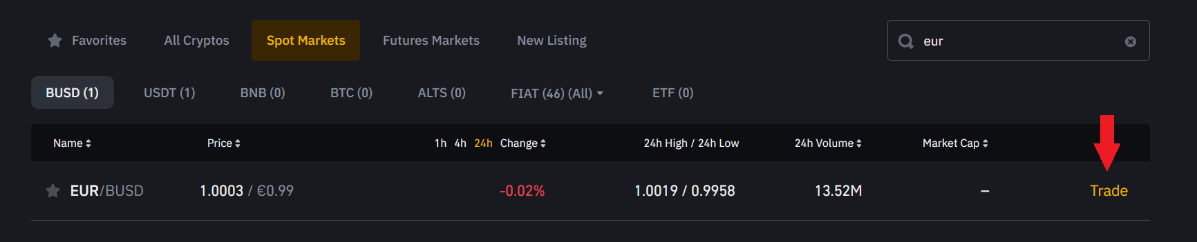 So let’s head up to the top of the markets, and look for your currency pair with BUSD. In this case it is EUR/BUSD, but if you have another currency, search for your currency against BUSD. For example, the following pairs: GBP/BUSD, USD/BUSD, etc.