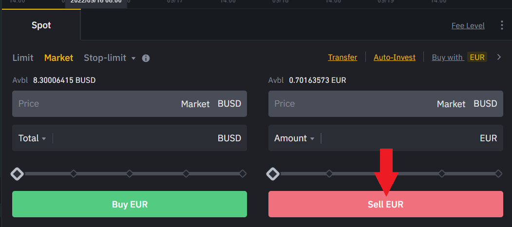 Once we click on the pair, we go to the centre below, in the buy and sell panel. And here we will change our currency for BUSD, in the red sell part. In my case, sell EUR to be able to get the BUSD. So, the first thing we will indicate is the top right market, following the amount you want to change your currency and finally click on Sell EUR or your currency. In the same way as you can see in the image.