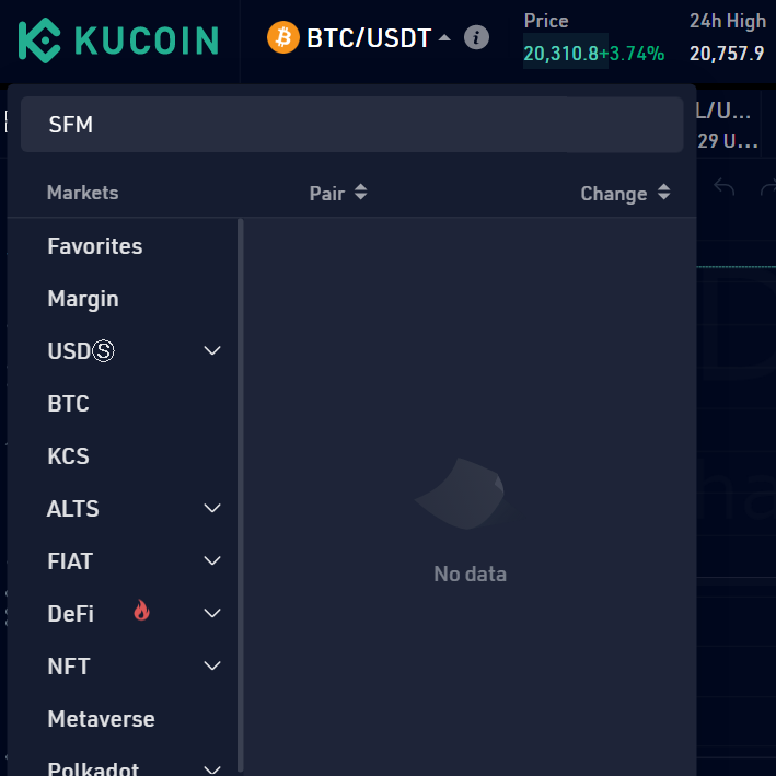 If you are reading this later, you can check on your own if safemoon is already on kucoin. To do this, go to trade and spot trading. And here, top left click on the current pair. Here, look for the safemoon ticker, SFM. And if a pair appears to trade, it is already in this platform. If no results appear, it is not yet listed on this Exchange as you can see below.