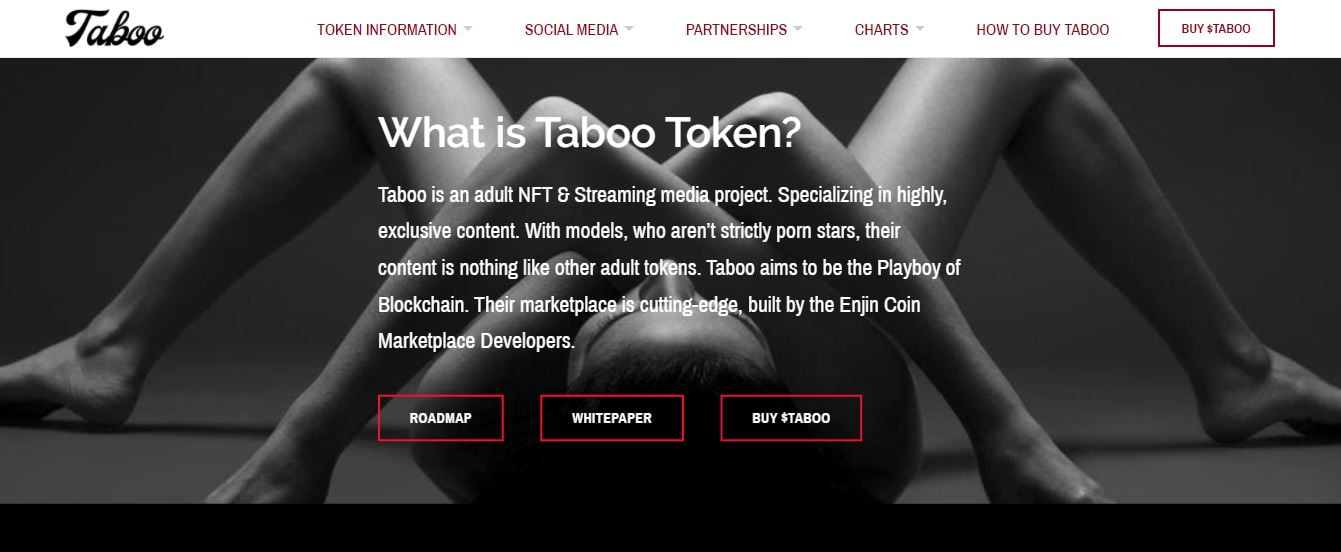 Taboo is a NFT and Streaming project for adults. It specializes in very exclusive content. With models, who are not strictly porn stars, its content is unlike other adult tokens. Taboo aims to be the Playboy of Blockchain. Its marketplace is cutting edge, built by the developers of Enjin Coin Marketplace.