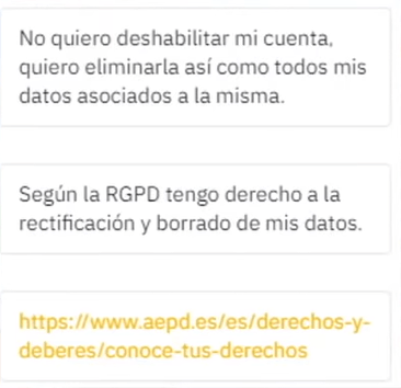 I do not want to disable my account, I want to delete it and all the data associated with it. According to the GDPR I have the right to rectification and deletion of my data. And the following link: https://www.aepd.es/es/derechos-y-deberes/conoce-tus-derechos.
