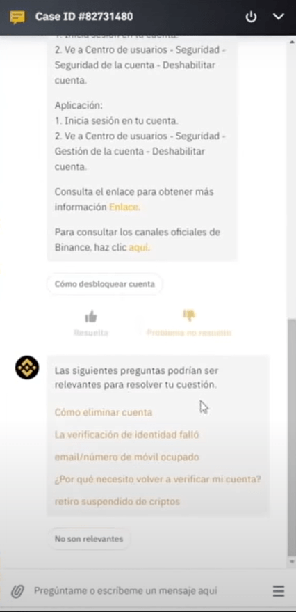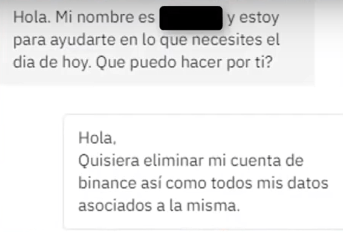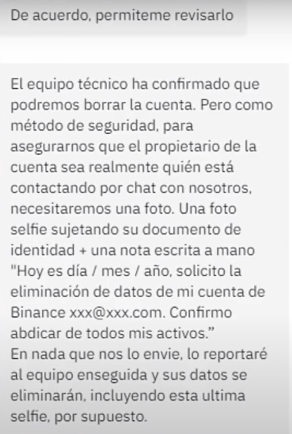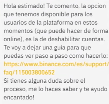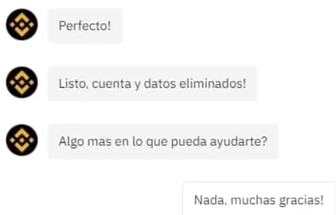 We can then contact support to have our account and its data deleted. Now, we will receive a message from binance support, and we will have to indicate the following.