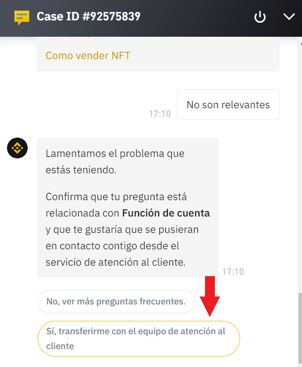 An automatic message will appear, and we will have to click on problem not solved. Now other questions will appear and click on not relevant. Finally, click on yes, transfer me to the customer service team.