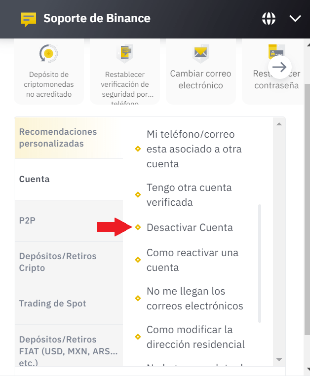 To do this, we will go to the official binance website and log into our account. With the account logged in, we will have to click on the right hand side under support. Here, we will go to the account option, and deactivate account.