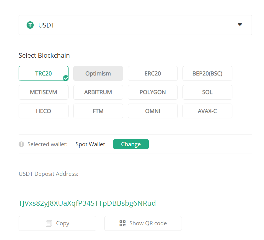 We should go back to Hotbit now, and go to the top menu under wallet, deposit. Here, USDT comes as standard, which is ideal. All that’s left is to select the TRC20 (Tron) network in networks or blockchain and if we go down you can copy the address where to send USDT from Binance. If you are using the Binance mobile app, you can click on show qr code so you don’t have to pass the address between devices, and just scan the code with your address.