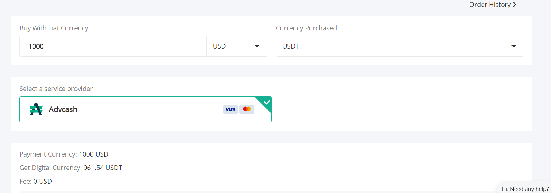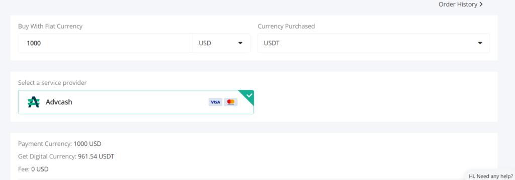 At the moment we only find advcash as an external platform to buy cryptocurrencies. Once you indicate the amount and the cryptocurrency, if you scroll down you can see the amount of cryptocurrency you will receive for that amount. And so calculate the commission. In this case, we have indicated $1,000, and we will receive $961.54. This means a commission of 4% approx.