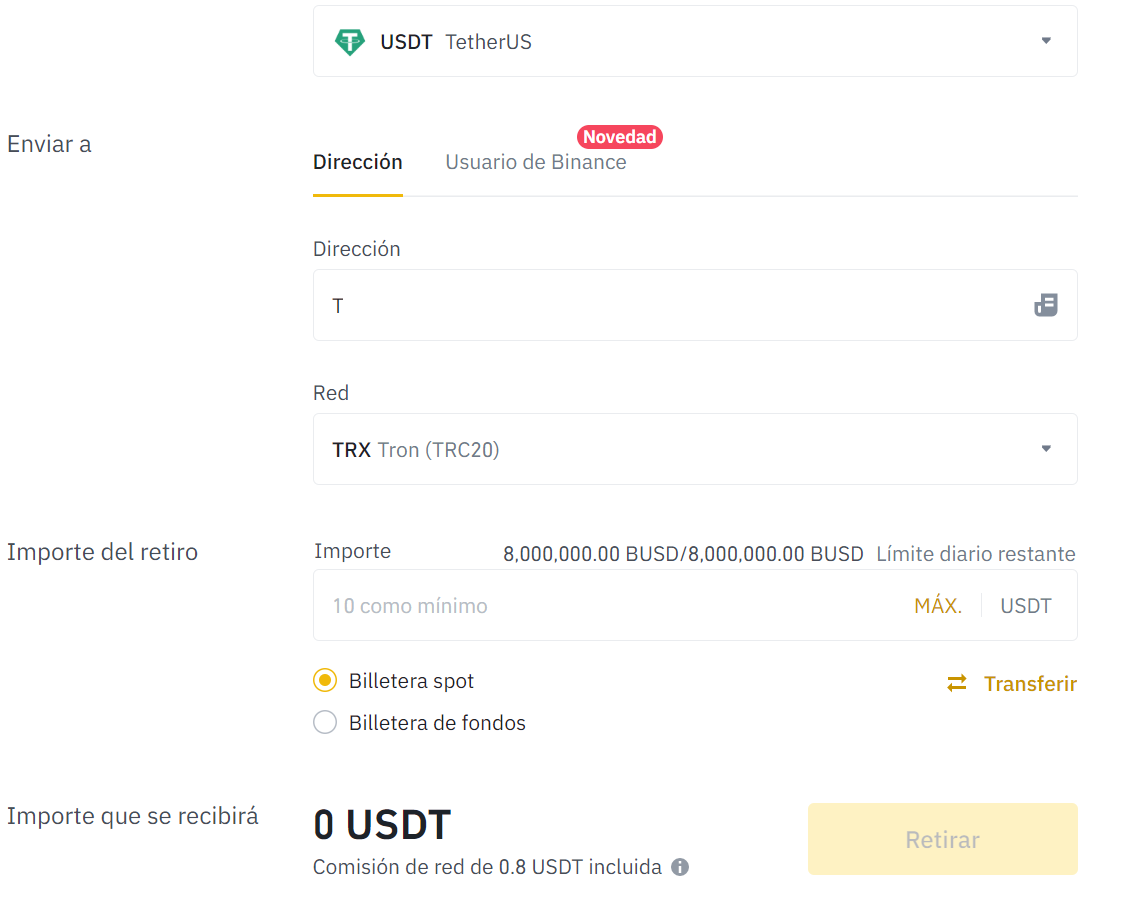 Now it’s back to Binance and you have to paste the HotBit address. We mark the TRC-20 (TRON) network, enter the amount and click on withdraw/withdraw. Confirm the withdrawal with the double authentication and you will have the USDT on your way to HotBit, where usually in a few minutes you will have them available to buy whatever you want on this Exchange.
