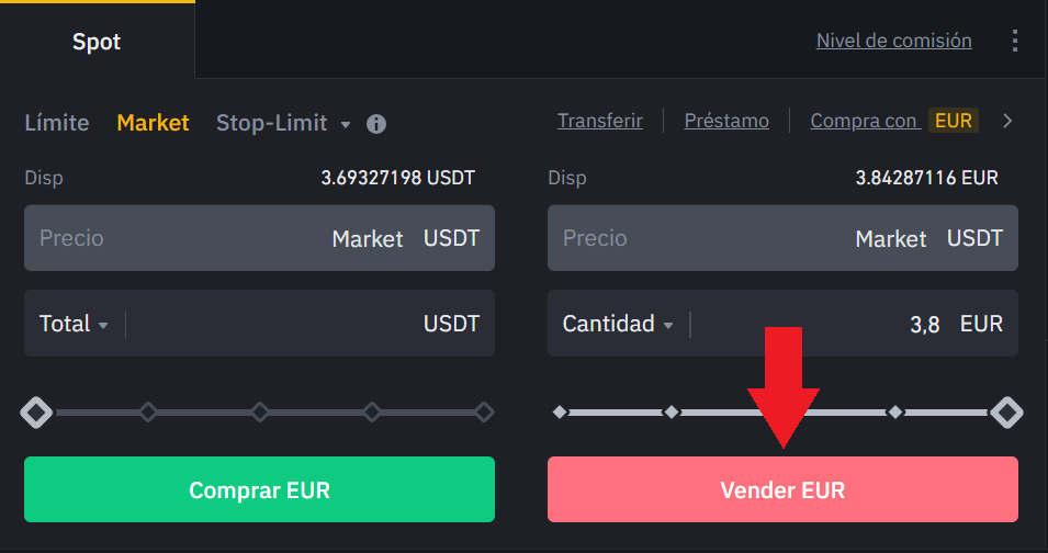 To get USDT, you have to go to market, fiat markets, and search here for your pair with the currency you have, in our case EUR/USDT. We will have to go to sell and mark the amount you want to use and exchange for USDT.