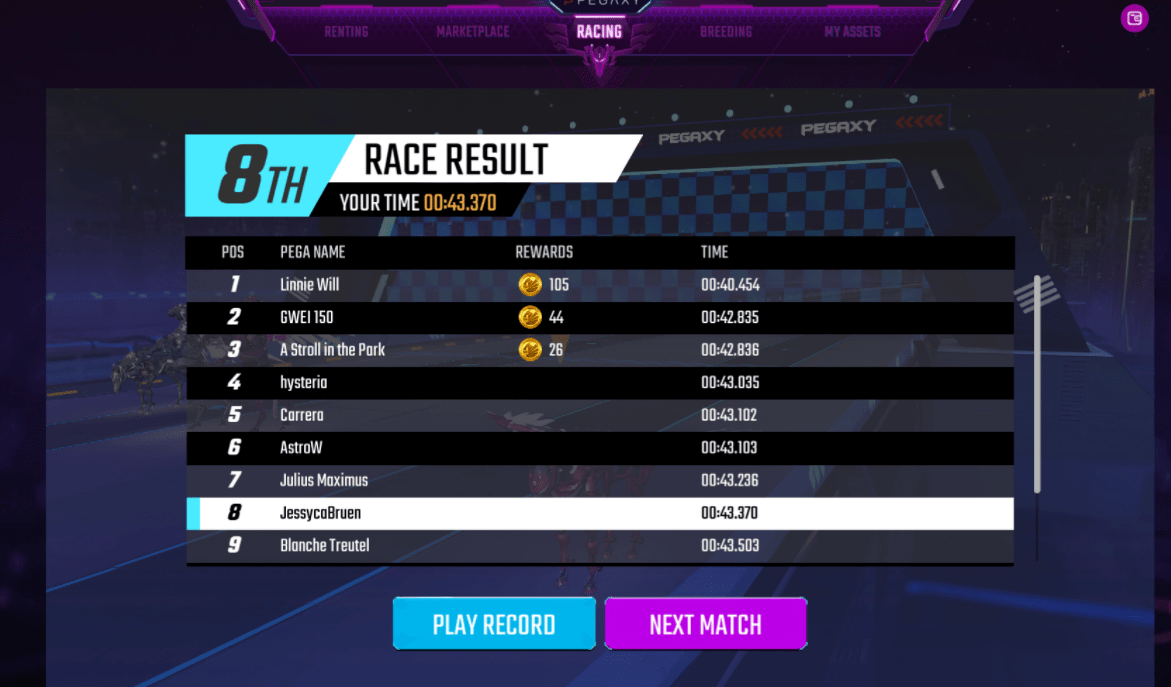 Another way to play is to rent a horse paying 40 PGX for one day. This is equivalent to 20$. And if you are lucky, you can win more than what you have paid to rent the horse and get a profit. Although this will depend on the luck you may have and in some cases you will earn money and in others you will pay more than what you can get from VIS.