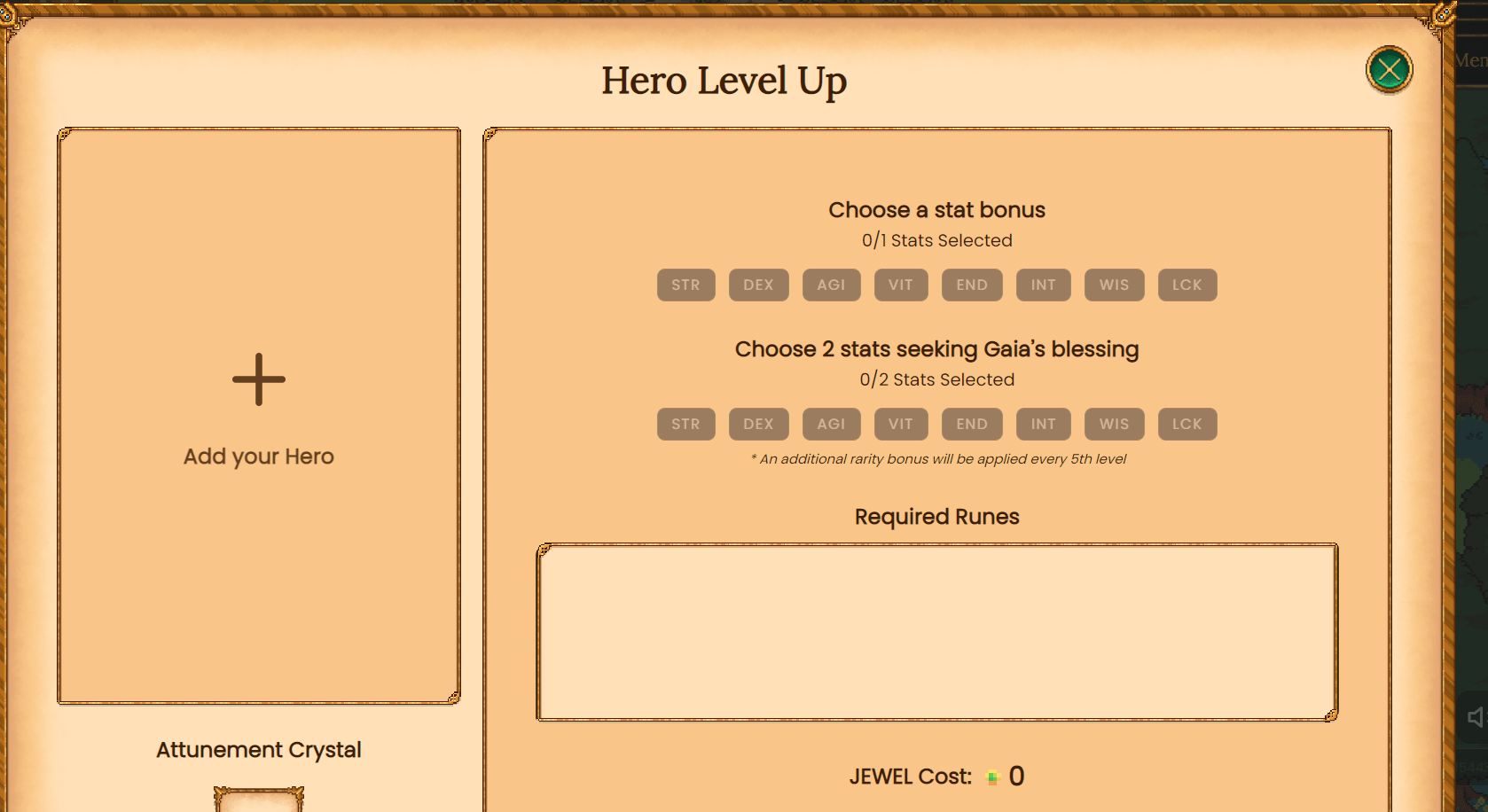 Select the hero you want to level up. Now you will see the cost, from level 1 to 2, the cost is 2 DFKSHVAS or Shvas runes and 0,2 JEWEL. Now, you must select an attribute that will be raised 100% of the time, and below two attributes that you would like to raise of your hero. The two attributes that you indicate below, will depend on luck and sometimes both attributes will be raised, sometimes only one or neither of the two marked in seeking Gaia’s blessing. The attribute that will always be raised is the first one you indicate.