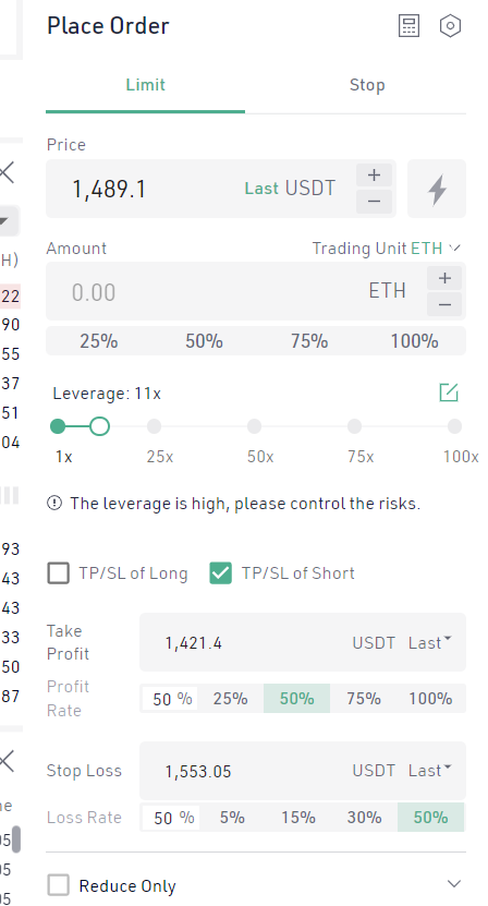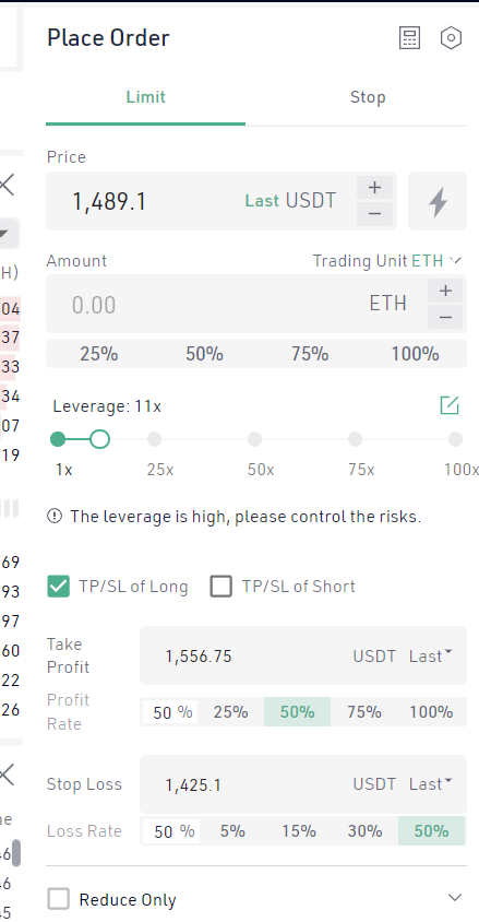 In futures pro, under leverage, you will see a TP/SL box. If you check it, you will be able to indicate both Take Profit and Stop Loss on the trade you are going to make. In KuCoin, you should check the TP/SL of Long if you buy (Go Long), and the TP/SL of Short if you sell (Go Short).