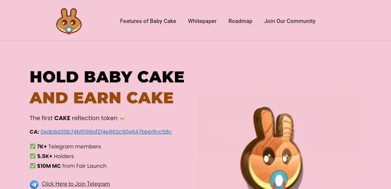 $BabyCake offers an innovative feature in its contract: DIVIDEND PROFITABILITY PAID IN CAKE! With the auto-reclaim feature, simply hold $BabyCake and you will receive CAKE automatically in your wallet. Hold Baby Cake and be rewarded in Cake on every transaction!