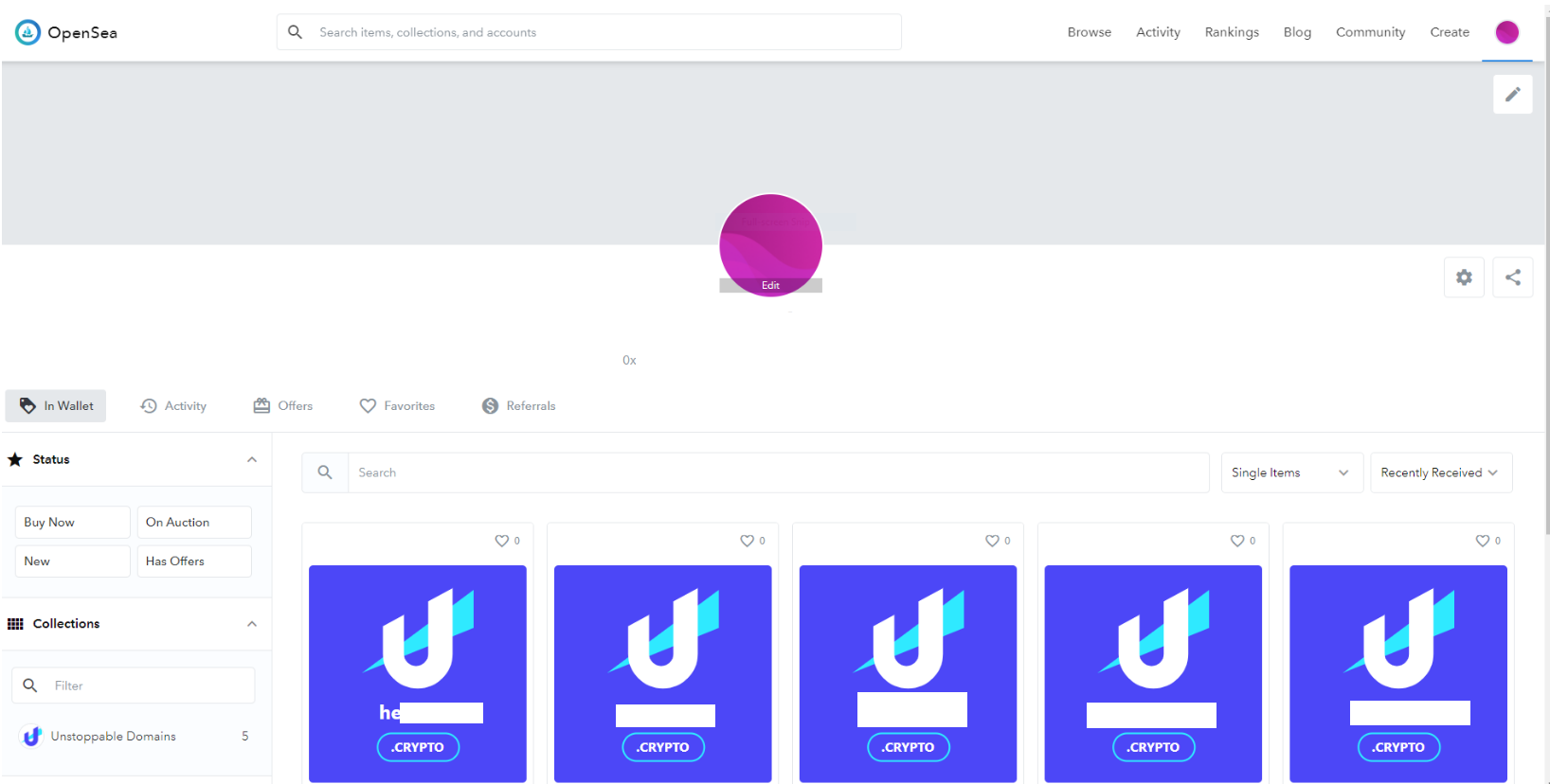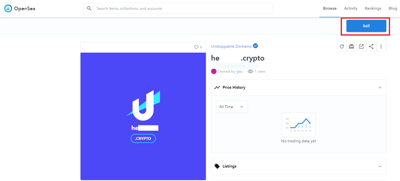 4. The account will be created and your .crypto domain or the extension you have will be visible in your account. Next, click on the domain you want to put up for sale.