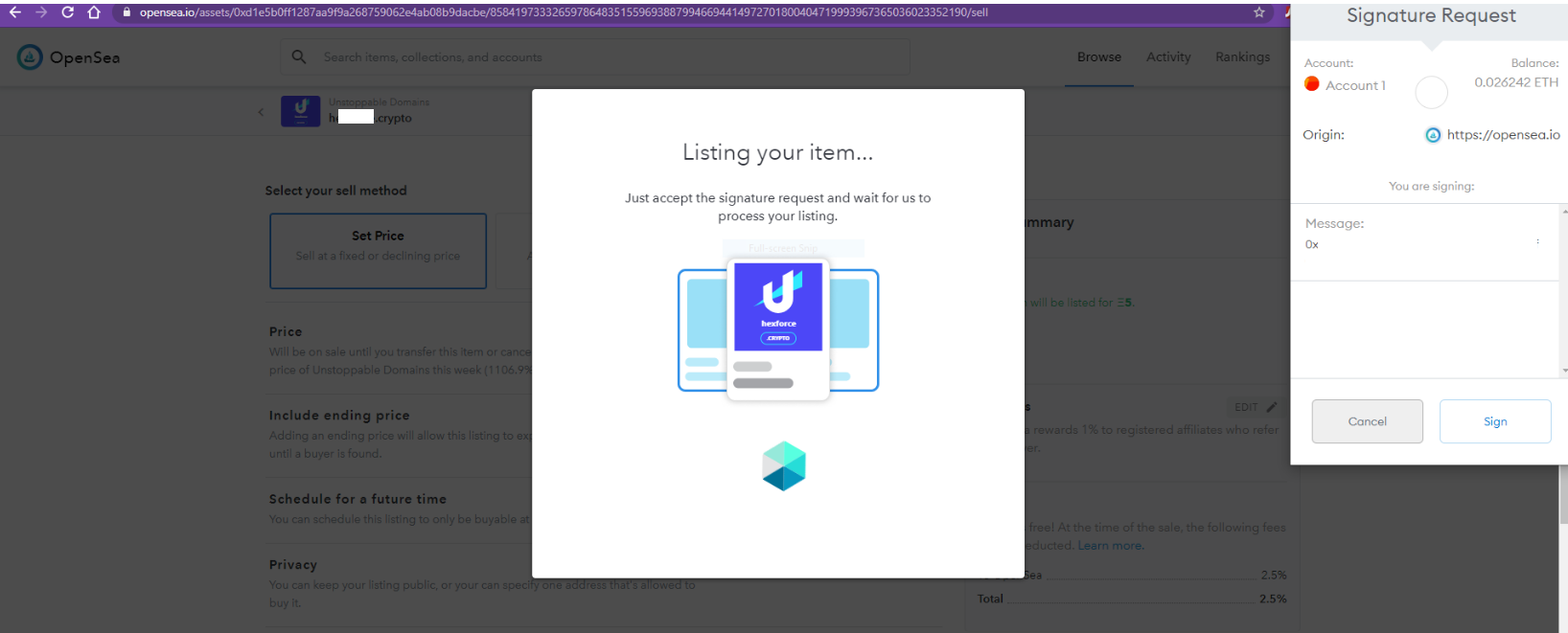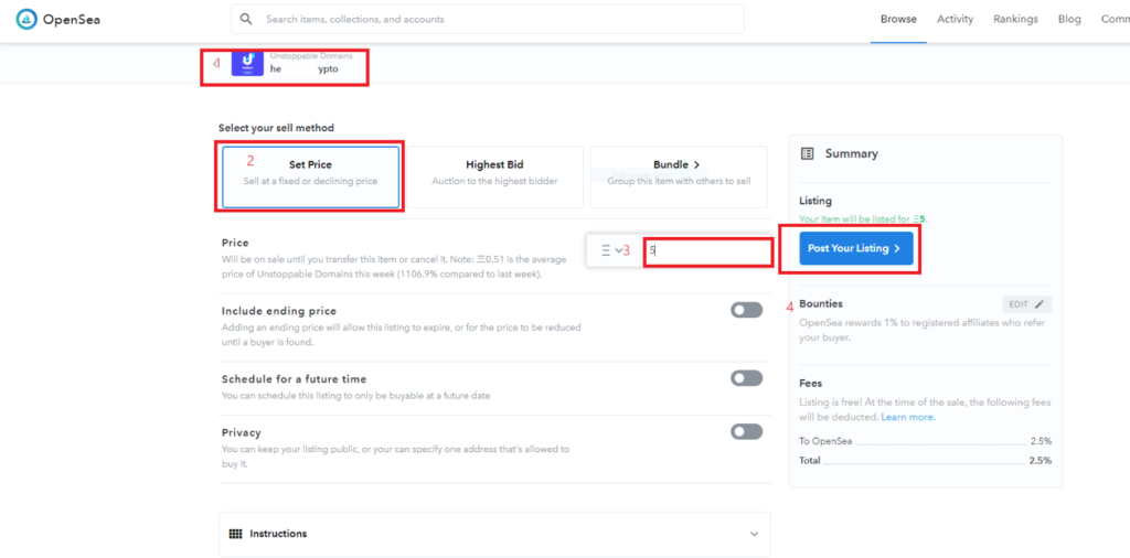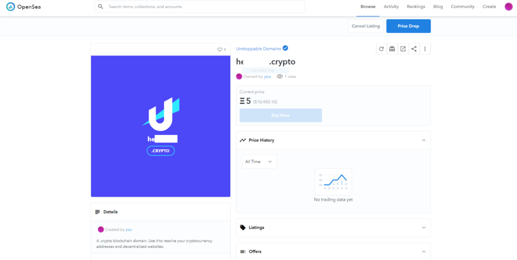 8. And just like that you have published your .crypto domain or any other extension for sale on opensea. Now it only remains for another opensea user to buy your domain and you have managed to sell it. Please note that you will not receive 100% of the price you indicate, as opensea has a 2.5% commission on the sale.