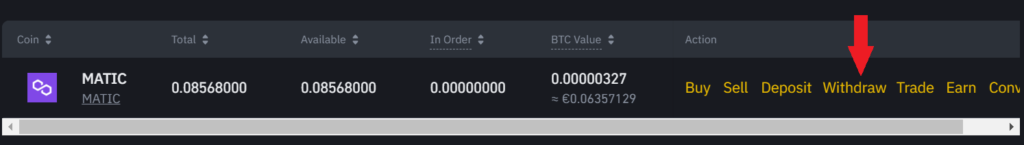 Here, we will go to the search engine and search for the cryptocurrency, in this case Matic. Once it appears, you will see different actions on the right side. Click on withdraw.