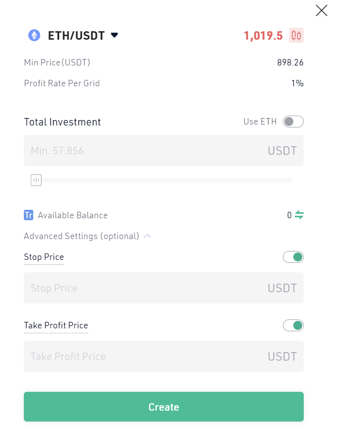 Underneath, you will see the box to indicate the total investment. In grey you can see the minimum amount you need to put in for the bot to work, and for each cryptocurrency it is different. But it is usually between 50-100 USDT.