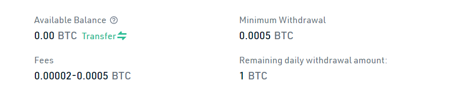 Lastly, and most importantly, withdrawals. And as you can imagine, there is a limit here. As you can see below, the limit is 1 BTC per day. So you will not be able to withdraw more than that on a daily basis. On a weekly or monthly basis there is no limit, but it is possible that if you move large amounts, at some point you will be asked to perform the KYC.
