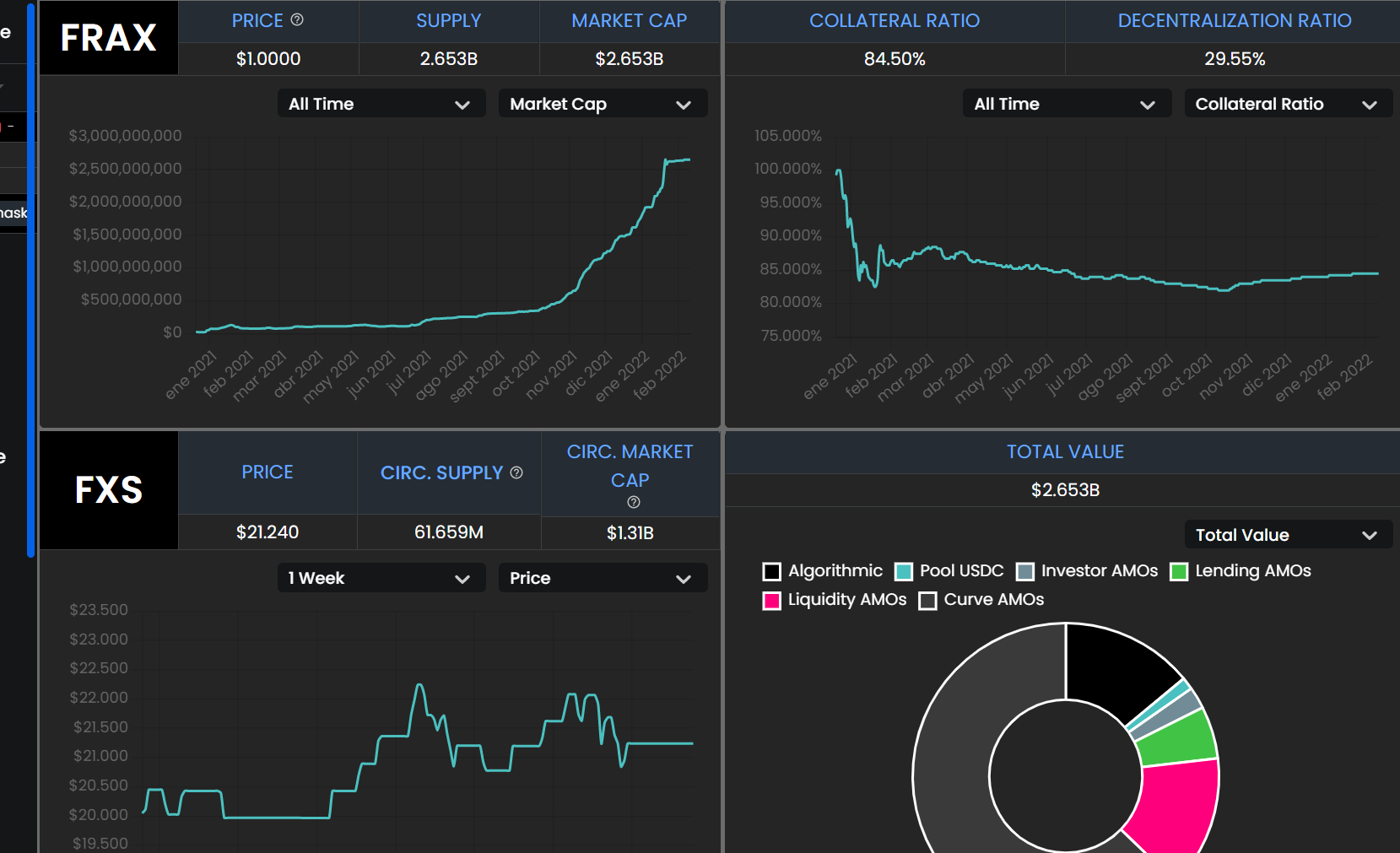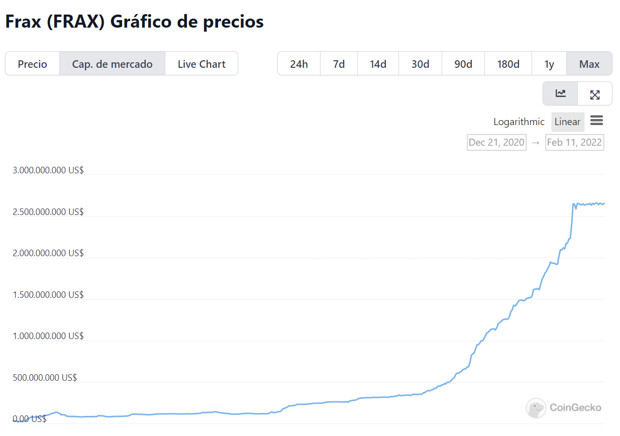 Another relevant aspect is the growth of the FRAX supply, where we can look at the market capitalization to see how many FRAX are outstanding. If there are 2.7 billion (American), it means that there must be backing for those 2.7 billion MIMs in circulation. What is interesting is to see the market capitalization and its evolution, to see if it has a very fast growth and there is a large supply of FRAX, to see if there is backing or they have just created more FRAX without a real backing. This you will be able to consult if there has been a percentage decrease of their collateral or just their supply has increased because there is also more collateral behind FRAX.