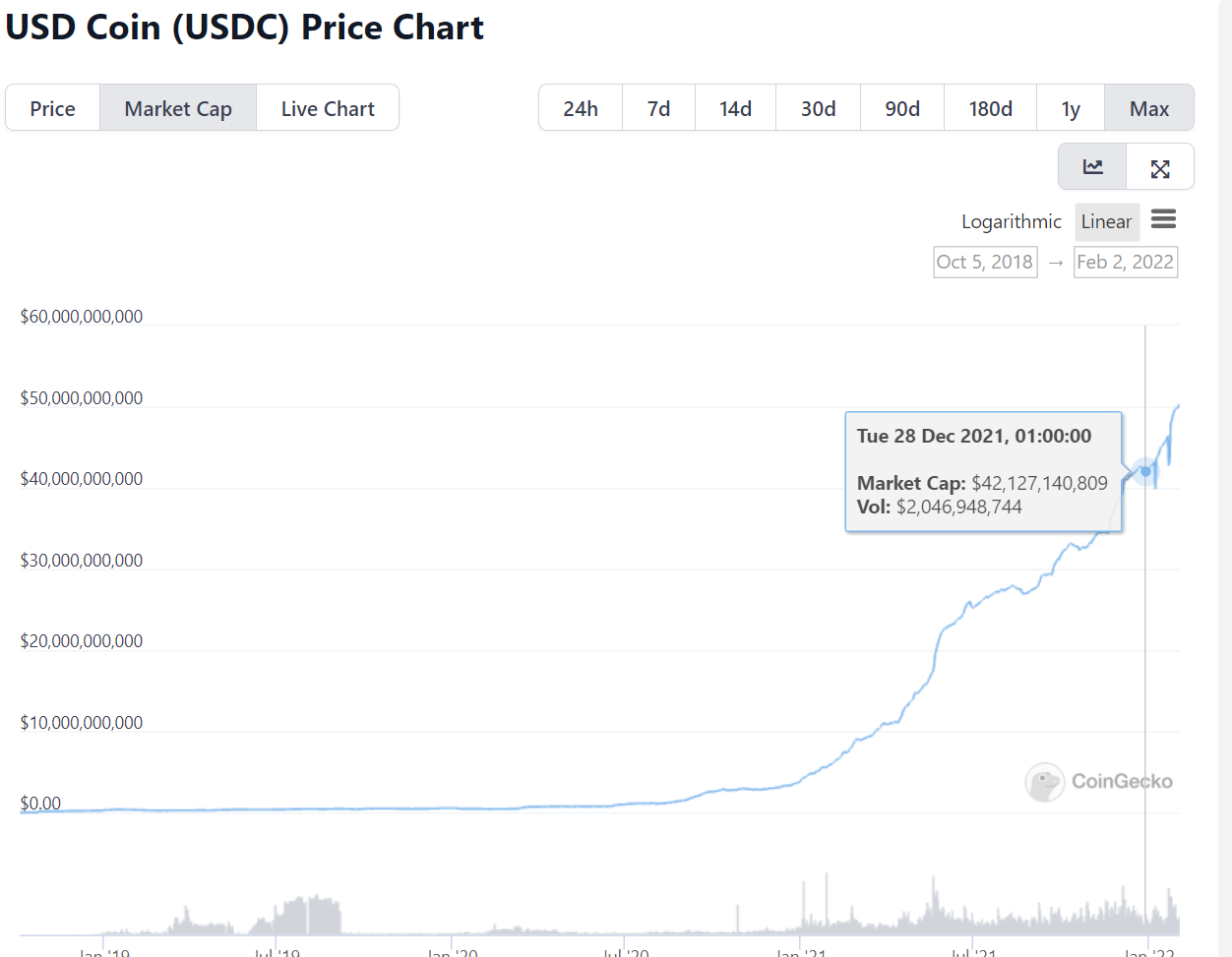 Another relevant aspect is the growth of the USDC supply, where we can see the market capitalization to know how many USDT are in circulation. If there are 50 billion(American), it means that there must be backing for those 50 billion USDC in circulation. What is interesting is to see the market capitalization and its evolution, to see if it has a very fast growth and there is a large supply of USDC, to see if there is backing or they have just created more USDC without a real backing. So seeing if there is an increase in their supply is also a factor to look at.