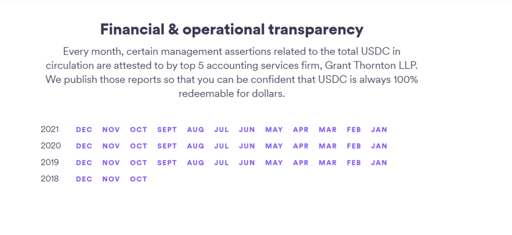 You can see it in a public way and really very easy, if you go to their circle page, and go to usd coin. If you scroll down on their website, you will see a section with the name Financial & operational transparency and below it all the documents, from 2018 until now. It’s as simple as clicking on it and you can see a report from the auditor, with the amount of USDC in circulation at that moment and the amount that there is as collateral in the circle treasury backing that stablecoin.