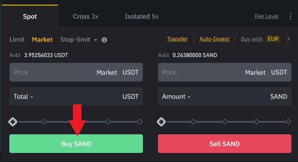 Cherchez la paire SAND/USDT, et cliquez dessus. Descendez au milieu, et allez du côté rouge de la vente. Entrez le montant que vous souhaitez vendre Sandbox et échanger contre des USDT. Cliquez sur vendre et vous avez terminé. Vous aurez vendu votre SAND et vous aurez à nouveau USDT.